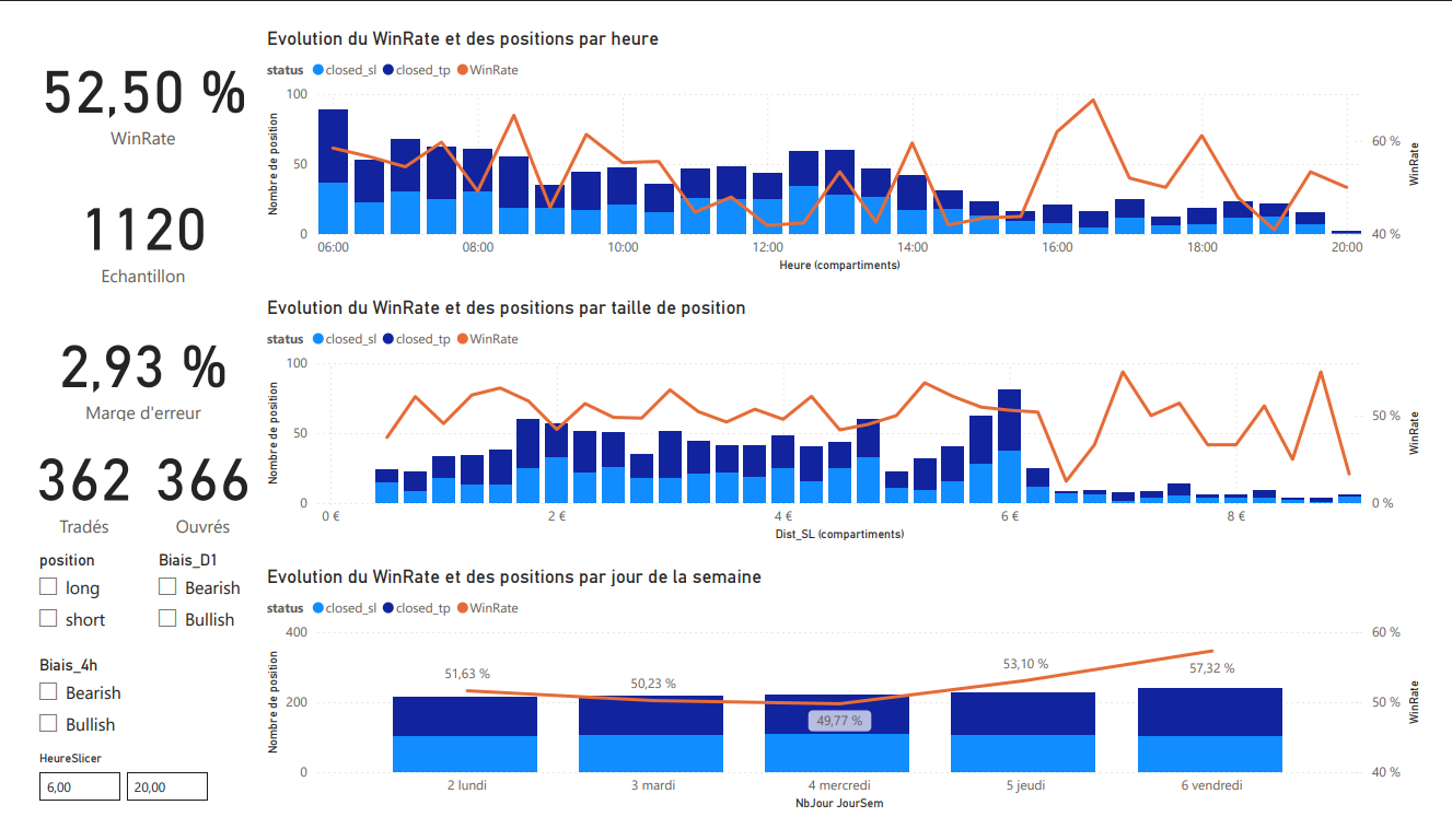 - 4. Affinage des paramètres en m'appuyant sur Python et PowerBI. Le paramétrage est réalisé dans l’outil Python et concerne les points suivants : pertes quotidiennes maximum, capital de départ, capital à risque, horaires de trading, ratio risque récompense, actif tradé.