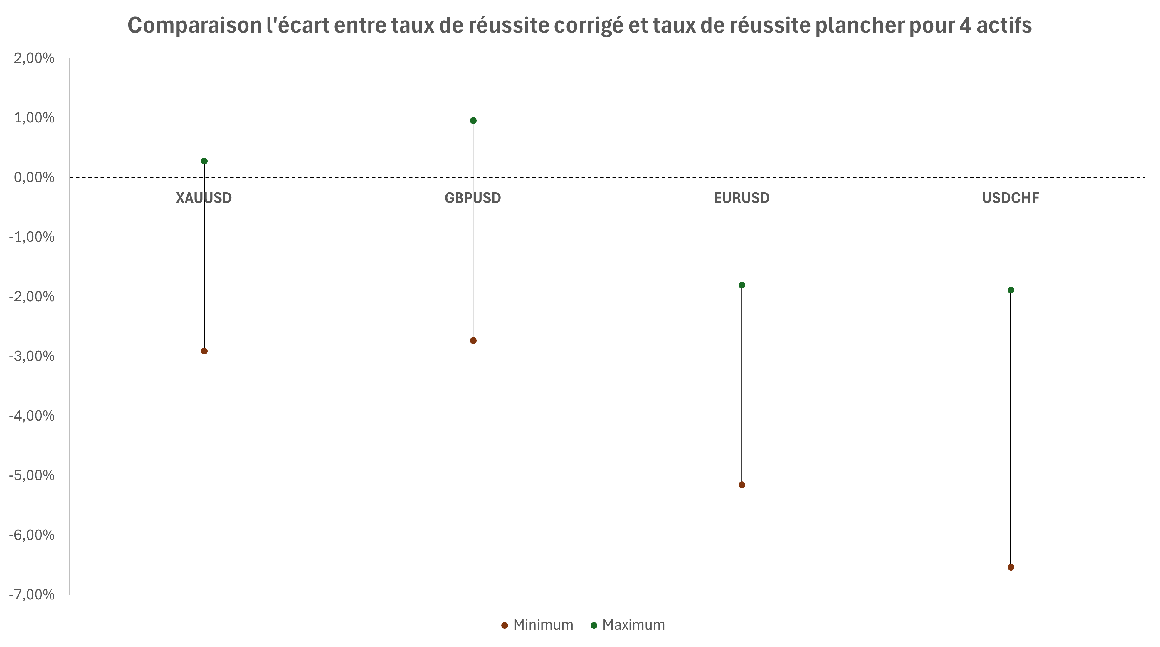 Le graphique ci-dessous présente un exemple de l’utilisation de l’outil pour 4 actifs. Les mêmes paramètres ont été testés pour chaque actif. Le point vert représente l’écart le plus positif entre le taux de réussite corrigé et le taux plancher, le point rouge, l’écart le plus négatif. La droite noire qui relie les deux points rassemblent ainsi tous les résultats obtenus pour chaque stratégie et permet de visualiser la différence entre la plus performante et la moins performante.